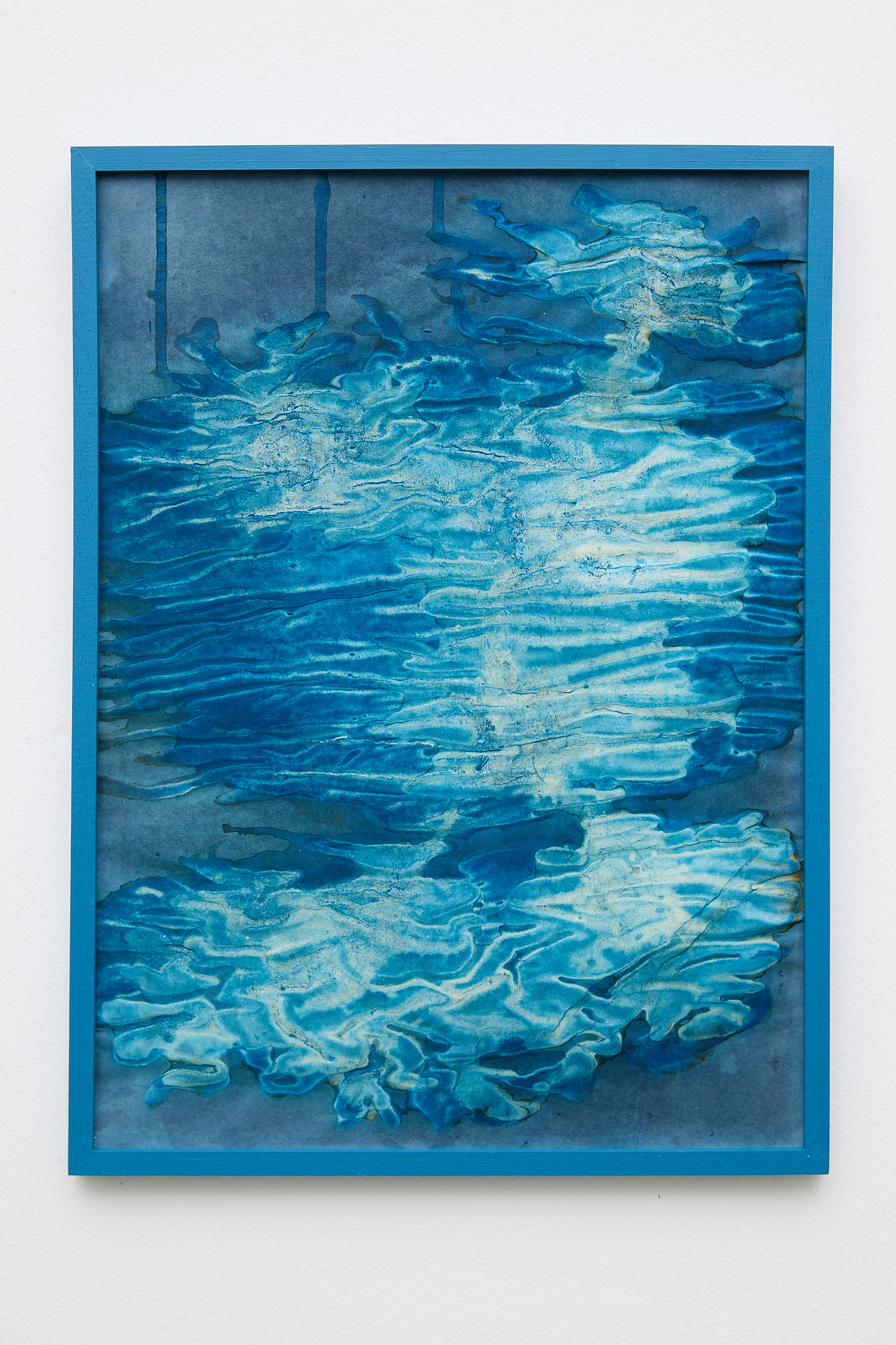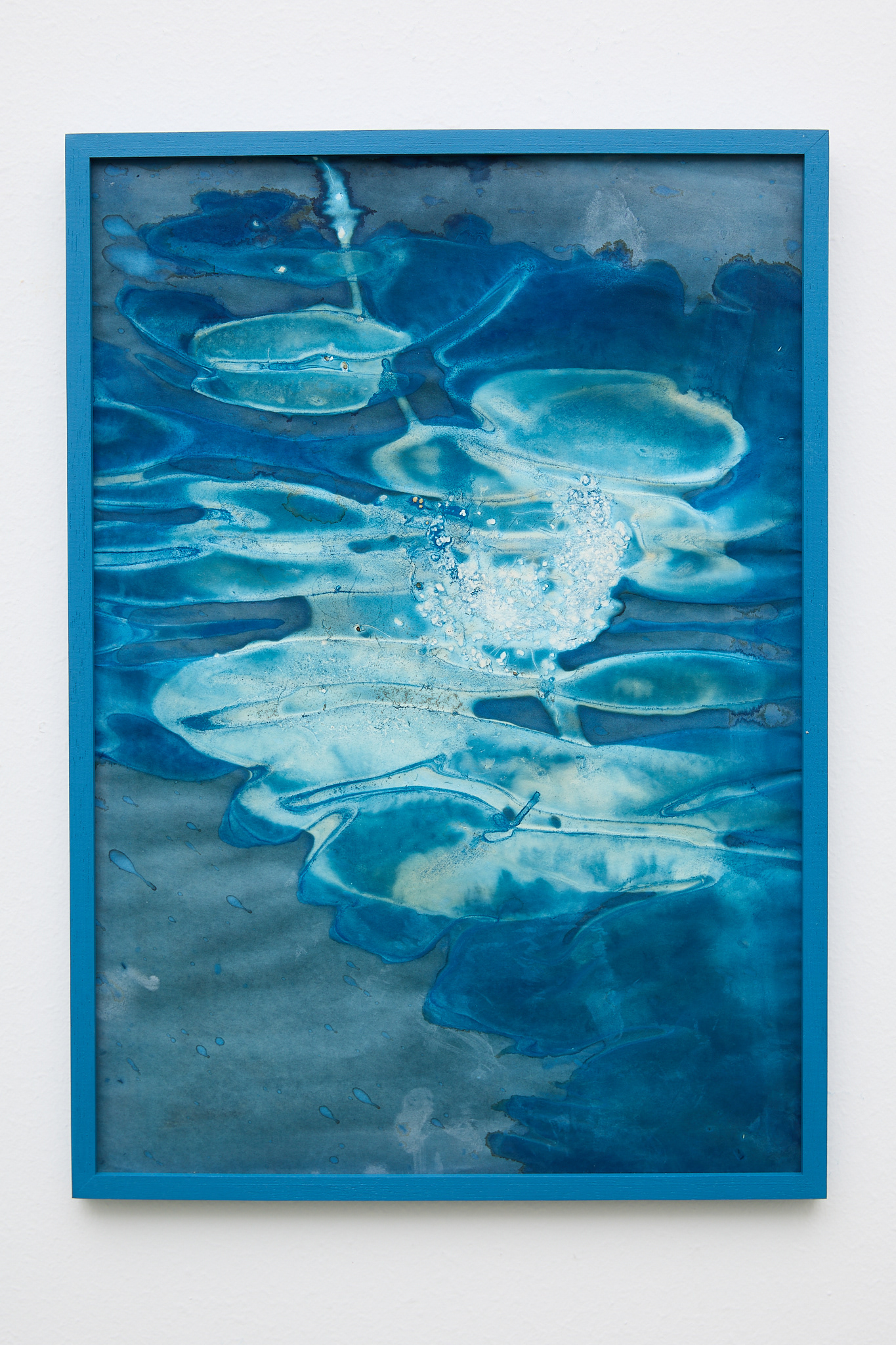 (Des)paisajes propone un extrañamiento visual y sensorial a partir de la agencia de cuerpos de agua. Cada pieza es un cianotipo por contacto directo -en cita abierta a la obra de Anna Atkins, ilustradora botánica del siglo XIX que fue pionera en el uso de esta técnica para registrar algas marinas-. (Des)paisajes altera deliberadamente ese procedimiento, transformando su lógica positivista en un espacio de experimentación sensorial y material. En lugar de una clasificación sistemática, cada imagen se construye mediante la exposición del papel fotosensible al sol y al contacto directo con aguas de ríos, arroyos, mares —cuerpos de agua que hoy atraviesan su entubamiento, contaminación o desaparición.